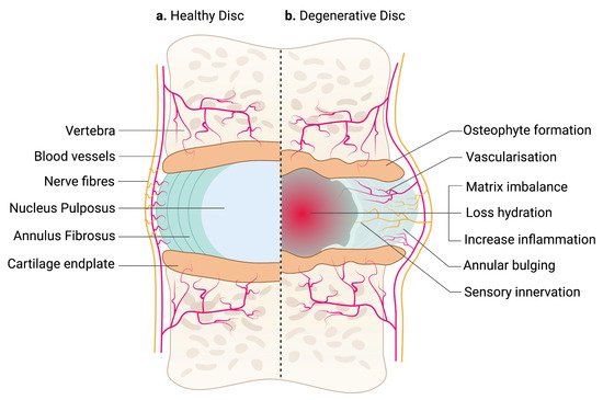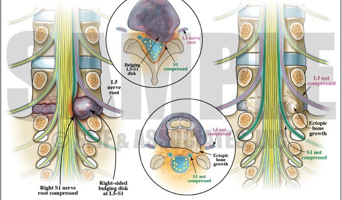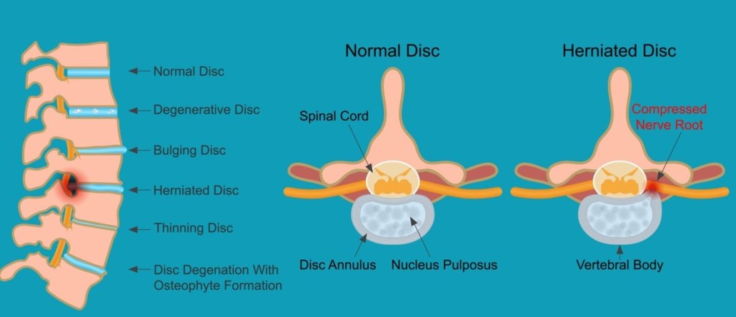 From the annular tear a prolapse or herniation can occur and as you can see above on the left a nerve root can be compromised.